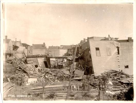 Collapsed buildings at 9th and Brannan, another location of major liquefaction during the 1906 quake, built on old waterways and wetlands.