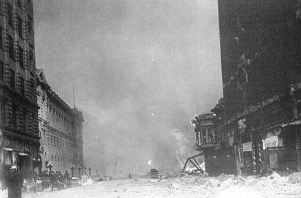Southward on 7th Street during 1906 Fire, then-new U.S. Post Office (now 9th Circuit Court of Appeals) at back left, Grant Building at 7th and Market in front left