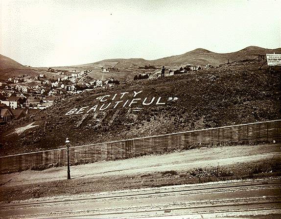 Castro Street slope between 23rd and 22nd, where a gardener gets into the celebration for the Panama-Pacific International Exposition at the city's northern edge.