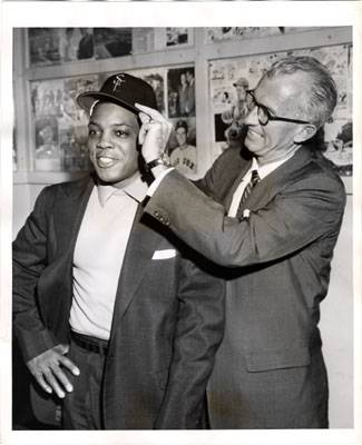 Manager Bill Rigney fits new San Francisco Giants cap on his star centerfielder, Willie Mays.