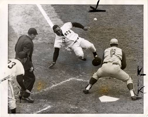 Willie Mays slides into home against Ed Bailey of the Cincinnati Reds in a 1960 game.