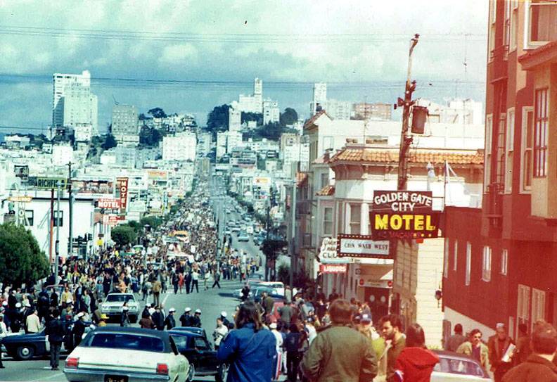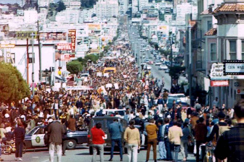1969 anti-Vietnam War demonstration at Baker and Fell, as seen from Baker and Page. Large building on left is former Southern Pacific Hospital, Panhandle in left foreground.