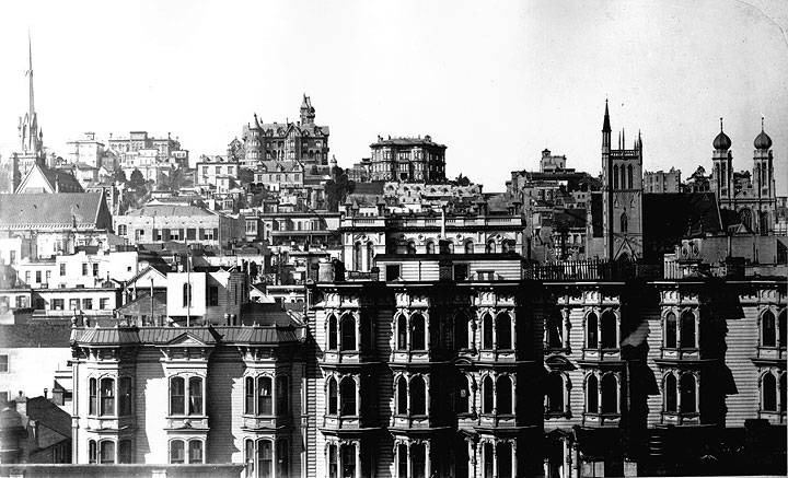 From Ellis Street looking north to Nob Hill, site of Crocker and Hopkins mansions, 1886.