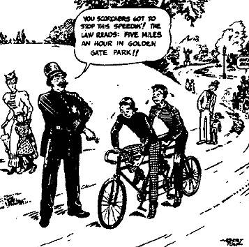 Cartoon about "scorchers" (bicycles) from the turn of the 19th to 20th century.
