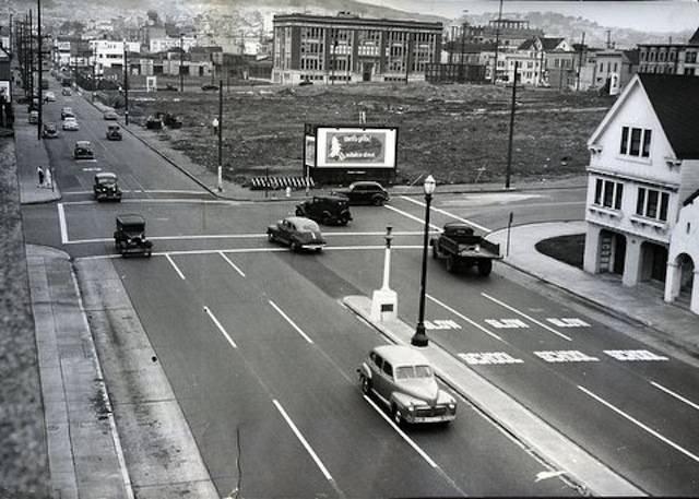 1953: Army Street, shown from street-level at South Van Ness, a few years after the Army Street widening was completed. Notice how then-and-now photos reveal that today’s nasty-ass Army St. streetscape design is basically unchanged from this time: