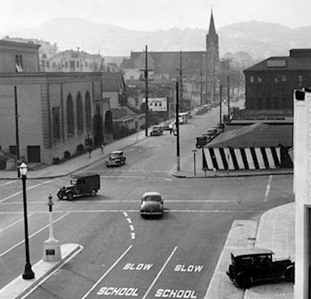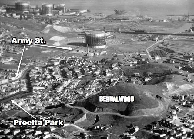 1931: Check out this amazing view of Army Street, looking west from Harrison, when it was a relatively normal San Francisco City Street (with a streetcar line!). That’s Le Conte Elementary School (now, Leonard Flynn) on the left, with the St. Anthony’s church steeple behind it. The church burned in the 1970s.