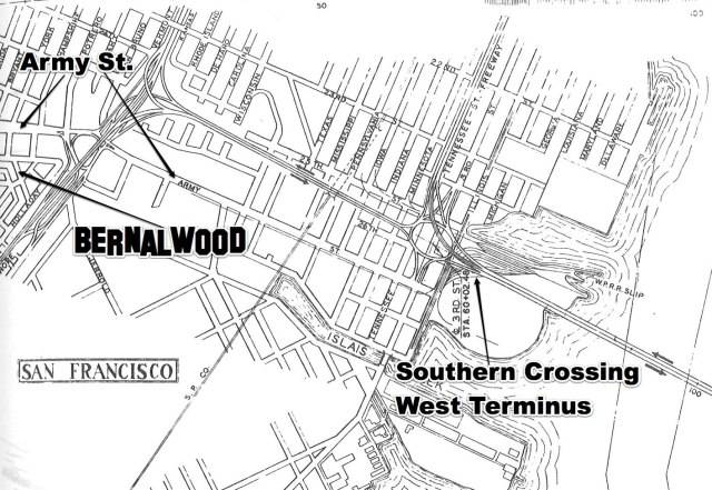 1973: Army Street/US 101 Spaghetti Bowl interchange built, replacing the roundabout that previously linked Army with Potrero Ave. and Bayshore Blvd. The new interchange was intended in part to serve traffic coming from and going to a future Southern Crossing: