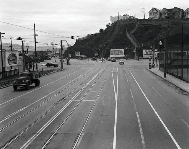 Army Street wall, view east on then-Army Street (now Cesar Chavez), near present-day Evans. Ocean Shore railway tracks at right, footbridge at Connecticut Street in distance.