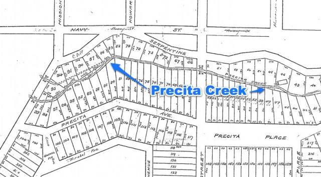 Circa 1900: Precita creek channeled underground, Army street built on top.
