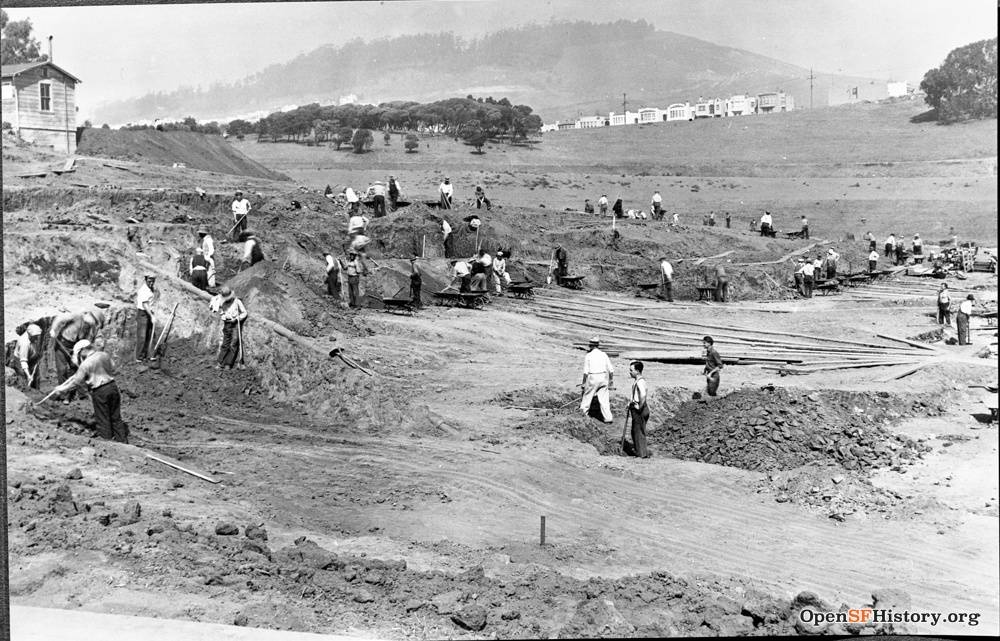 Another view of WPA workers grading the site for City College of San Francisco in approximately 1934-35.