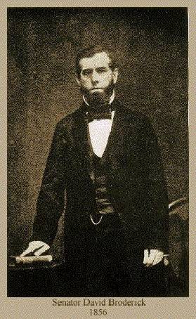 Born in 1820, David C. Broderick arrived in San Francisco from New York in June of 1849. Back in New York he had been a stonecutter, volunteer fireman and barkeeper but he had much higher ambitions and left for the new territory of California to seek better opportunities. His rise in California politics was meteoric: from foreman of a volunteer fire company in December of 1849 to California State Senator in January 1850 to president pro tempore of the California Senate in April 1851. Throughout the 1850's, Broderick was the leader of the anti-Lecompton (i.e. anti-slavery) wing of the California Democratic party which was consistently in the minority. He was also one of the very few upholders of democracy when the two Committees of Vigilance took power in San Francisco in 1851 and 1856. In 1857, Broderick, master politician and tactician, had managed to get elected to the U.S. Senate by exploiting internal differences within the Chivalry.