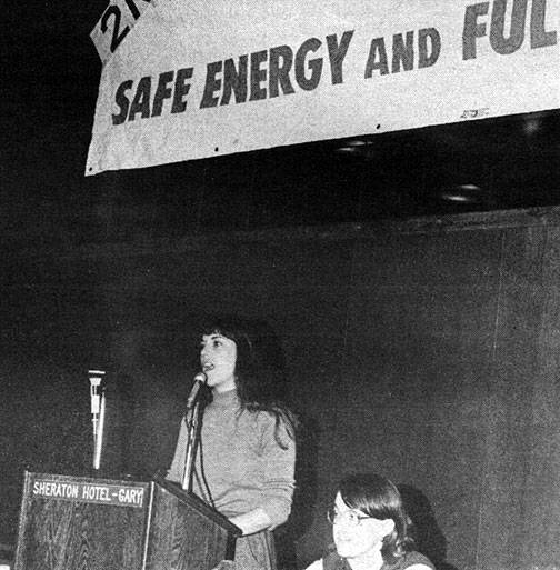 Susan Swift speaks at Gary, Indiana anti-nuclear conference, 1982.