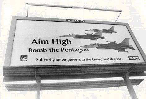 By noon the board had been covered with the same sign. It looked great ... until the next winter rain, when the added letters ghosted through the wet paper: next to "Aim High" were the words "Blow Up The Pentagon!"