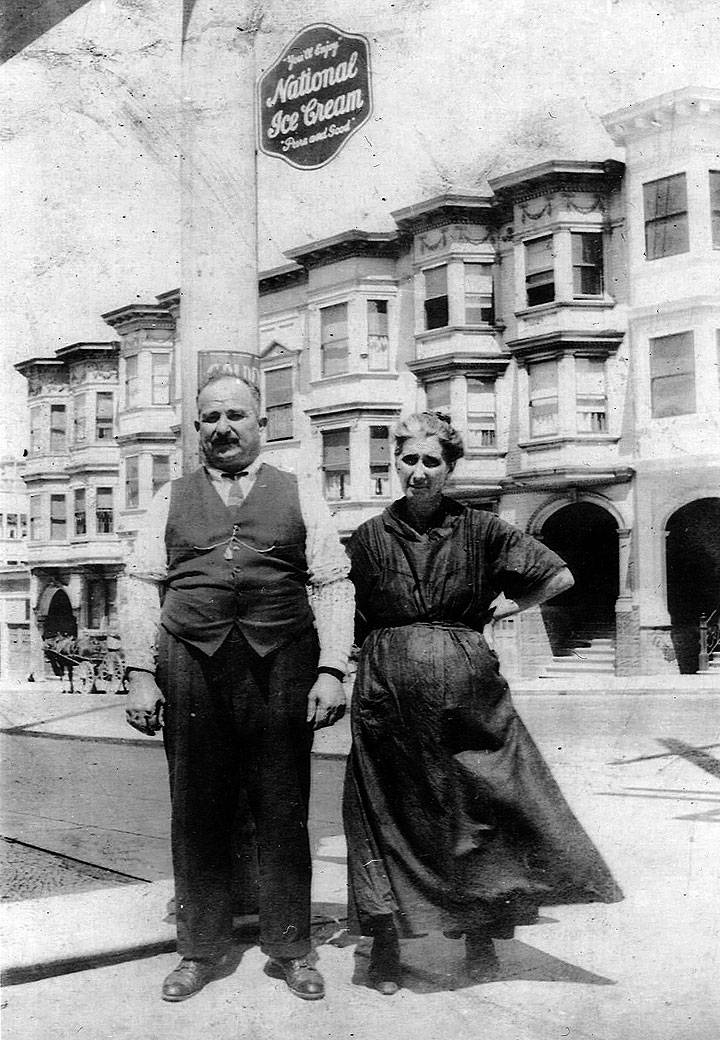 This is the 1918 photo of Pietro Alioto and his wife at the shop on Lombard and Mason.