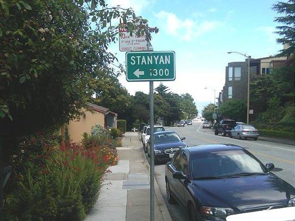 'Top of Stanyan Street stairs at Clarendon Avenue, 2011 - This is the spot where my walk began on Clarendon Avenue. Stanyan Street no longer comes through. The sign points to several houses accessed by the isolated stairway.