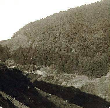 The road leading to Seventh Avenue from Laguna Honda with Sutro Forest above, 1910s. The road back to the City, about half a mile north of the Almshouse (this is the location of present-day 7th Avenue). Around the bend and over the treeless portion of the hill (left) is the area not far from where the author began his walk.