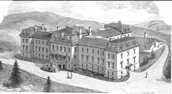 Lithograph depiction of the old Almshouse on the present-day site of Laguna Honda Hospital.