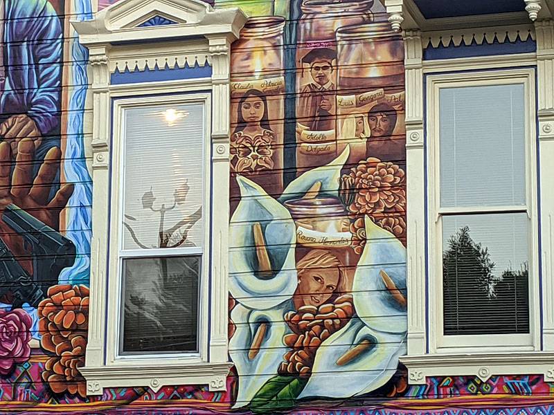 The mural portrays Amilcar, his family demanding justice, and the other community members recently killed by SFPD: Mario Woods, Alex Nieto, Luis Gongora Pat, and Jesus Adolfo Delgado. The mural also depicts immigrants and migrants killed along our Southern border: Roxana Hernandez, Claudia Patricia Gomez Gonzalez, and Oscar and Valeria Martinez.