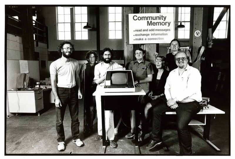 Staffers of Community Memory, early 1980s (Lee Felsenstein in darker shirt in middle under sign).