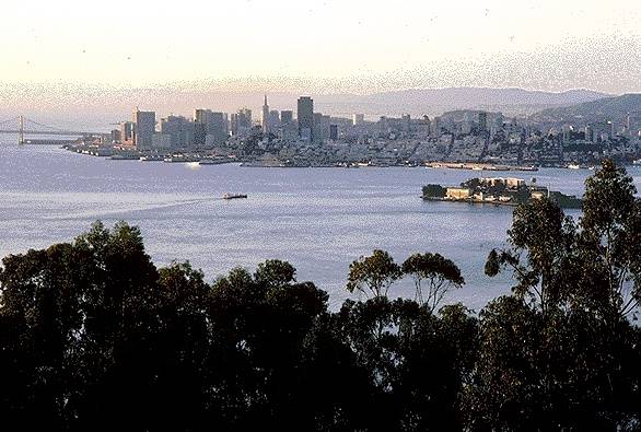 View of San Francisco, 1990s, from Angel Island. Trees in foreground are mostly Australian Blue-Gum Eucalyptus, (that were removed) by the Park Service in order to make way for the replanting of native species. Dana describes an island covered with trees, and of course in those days, the view of SF would have shown a windswept, sandy land covered with hills and valleys.
