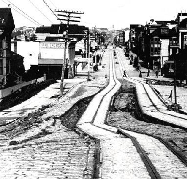 People begin piling personal effects along the sidewalks. Van Ness between Washington and Clay was piled with chairs, kitchen tables, etc., even an upright piano. People seem almost apathetic, due to a delayed state of shock. Bubonic plague is now affecting members of the white community and can no longer be dismissed as a "typically oriental disease." Gen. Funston prepares to blow a trench 50 yards deep the whole length of the south side of Van Ness down to Golden Gate Avenue through to upper Market Street and along the length of Dolores Street.