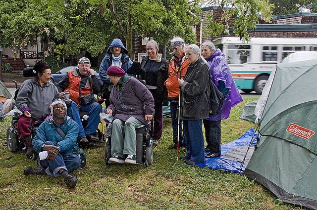 Arnieville protesters camp out on a street median. A coalition of homeless and people with disabilities. The poet, Jean Stewart, is seen in the center of the photo.