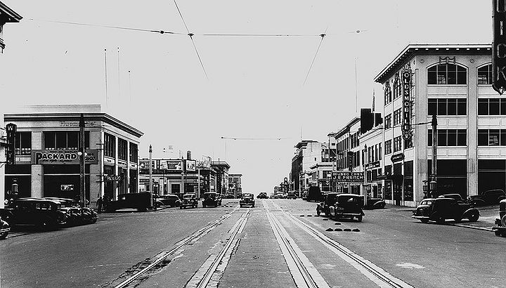 Van Ness Avenue south at California Street, with an H-streetcar making its way through "auto row" in 1936.