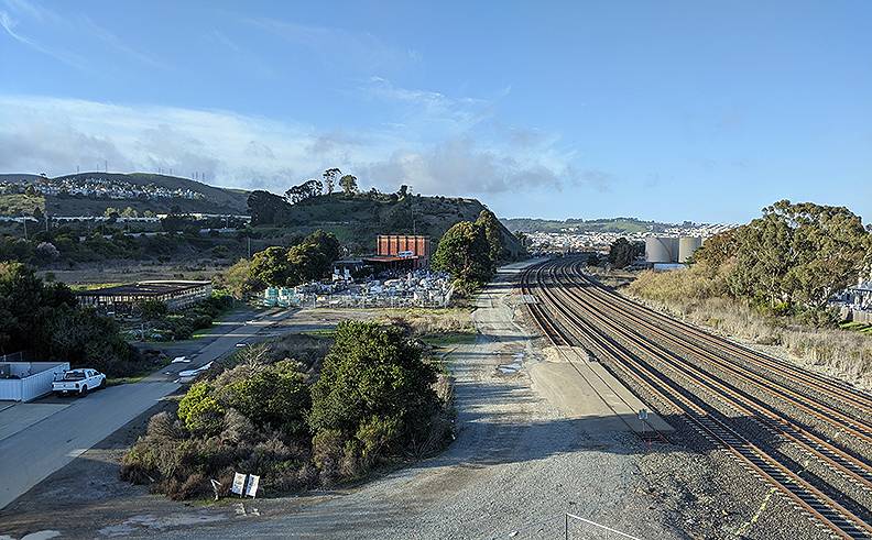 Northerly view from above San Bruno Mountain with railyards and San Francisco dump in foreground, SF city limits not far north of the bottom of the photo.