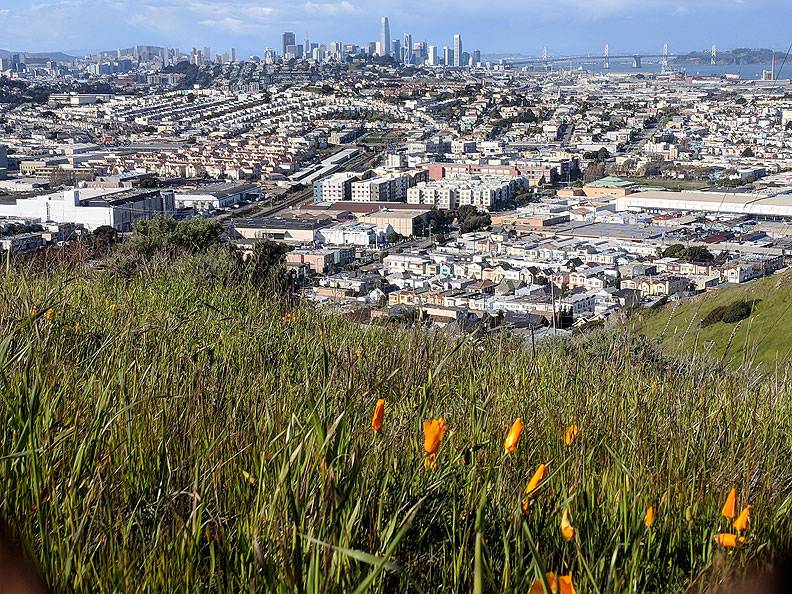 Bayview Hill and Hunters Point shipyard seen from San Bruno Mountain. Candlestick is visible to the right of Bayview Hill, and the former naval shipyard (now an EPA Superfund site) sprawls into the bay.