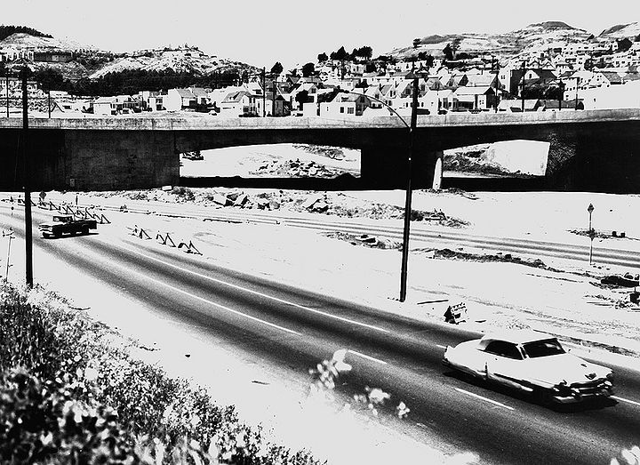 I-280 freeway under construction at Mission/Alemany viaduct, c. 1965.