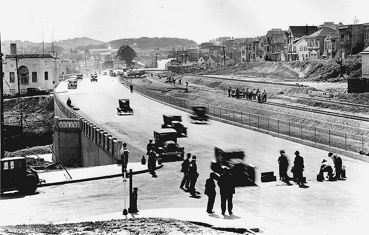 San Jose Avenue southwest at St. Mary's Avenue. Southern Pacific Colma line and Arlington Street at right. Monterey Blvd. in center distance, on opening day of the new Bernal Cut, April 16, 1930.