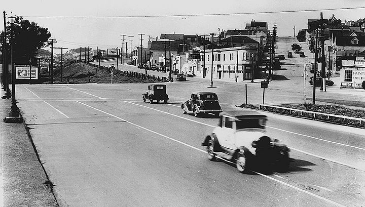 San Jose Avenue northwest at Sickles Street, Southern Pacific Railroad running down the street, 1926. Interstate-280 now runs along this right of way.