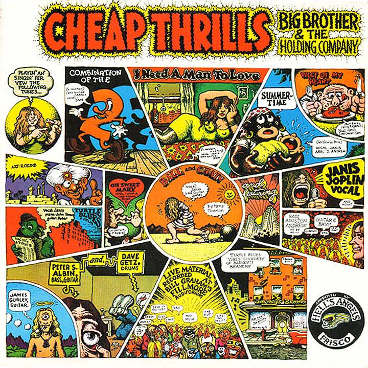 Weeks after Janis joined, Big Brother rushed into a studio to record their eponymous debut album for the short-lived Mainstream label, to little acclaim. Soon thereafter, though, their mind-blowing performance at the 1967 Monterey Pop Festival brought them worldwide attention. A Columbia Records mega-deal led to the band’s landmark Cheap Thrills album, recorded between March and May 1968. Dubbed-in audience noise gave listeners the impression that the whole album was a live recording, but only “Ball and Chain” was recorded onstage. The other six tracks were taped in studios in New York and Los Angeles. Robert Crumb, the preeminent underground comic book artist, created the hippie-influenced cover artwork.
