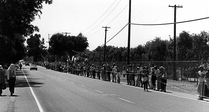Lawrence Livermore blockaders encircle the Labs with string.