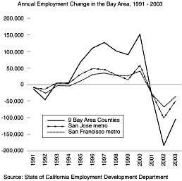 In the Valley, 225,000 jobs vaporized from the peak of 1,066,000 at the end of 2000 to the bottom of the slump in fall 2003, or over one-fifth of the total; in San Francisco and San Mateo the loss was160,000 out of 1,111,000, or 14%; and in the East Bay, 47,000 out of 1,073,000, only 5% (because that part of the region is the least dependent on electronics). That makes a total job loss of an astounding 434,000 around the Bay Area on a base of 3,250,000, or 13.4% (one-seventh of all jobs). The jobless rate in Silicon Valley hovered in the 7-8% range for three years; in San Francisco around 5%, despite the departure of tens of thousands of dot-commers.