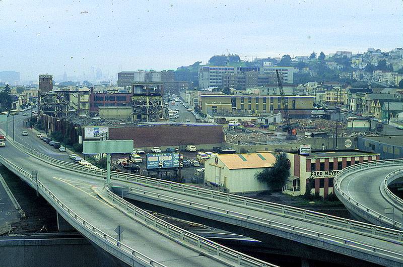 Northerly view from Peralta and Holladay on Bernal Heights, demolition of Borden Dairy underway, 1973, future site of The Farm.