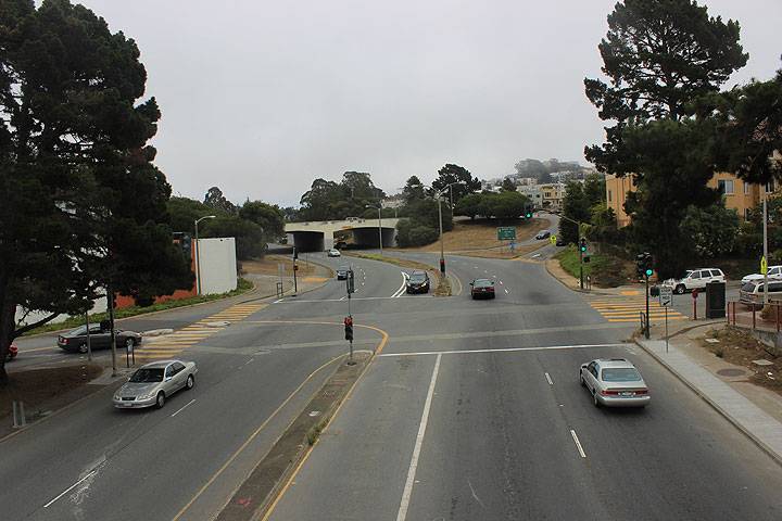 Brotherhood Way at intersection with Charles Avenue, Junipero Serra crossing on overpass in distance (looking westward), 2014.