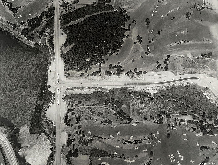 Aerial shot in 1938 looking down on Brotherhood Way where it connects to Lake Merced Drive, photo by Harrison Ryker.