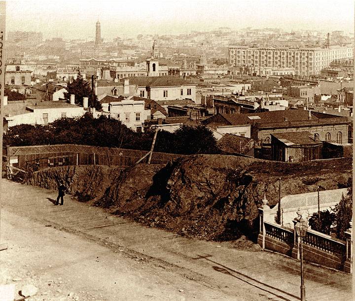 In 1869 two major changes in the streets south of Market greatly changed the nature of the district. First was the Second Street Cut, which nearly leveled Rincon Hill's one-hundred-foot elevation of sand. The stated goal was to facilitate heavy goods traffic to and from the Pacific Mail Steamship Company's docks and warehouses on the waterfront between First and Second streets (sole survivor of the complex is the 1867 Oriental Warehouse near First and Brannan). The hidden agenda was real estate speculation. In spite of granite facing, stairs, and a bridge at the Harrison Street crest, the cut proved brutal surgery on the hill. The sand kept slipping and caving, endangering workmen and wrecking noble houses. Then the wealthy fled from Rincon Hill, leaving the whole South-of-Market area to working-class residents.(26)