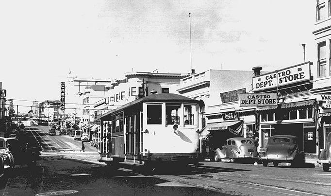 Cable car clangs along past the famous Castro Theatre, c. 1939.