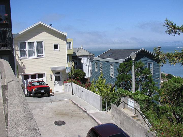 View of Calhoun Terrace from Sansome and Green below, decades after quarrying ended, but left little of the original Calhoun, now a cement platform.