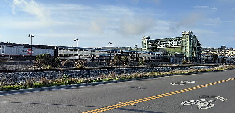 Caltrain, the publicly maintained commuter rail from San Jose to San Francisco, rolls south near the 22nd St. station.