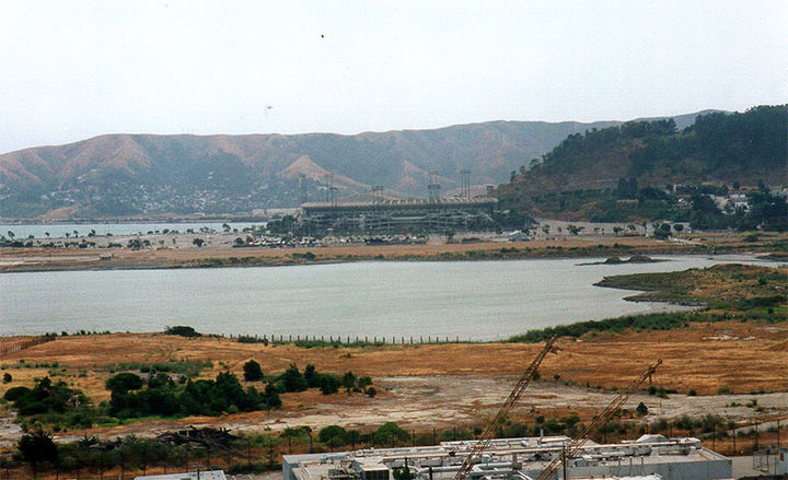 Candlestick Point under Bayview Hill, the State Recreation Center extending eastward into the bay, 2015.