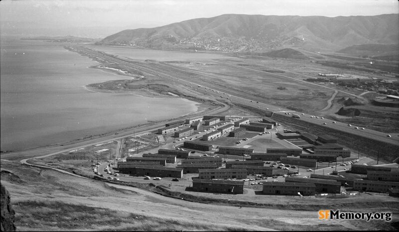 View From Bayview Hill 1953. Causeway for Highway 101 under construction. Candlestick Cove housing still in place in foreground bottom.