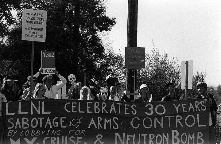 Demonstration at Lawrence Livermore Laboratories, about 30 miles east of San Francisco, protesting their management and promotion of the U.S. first strike nuclear war capacity, 1982.
