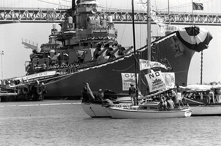 Peace Navy obstructs USS Missouri during contentious campaign to homeport the Missouri in San Francisco during the 1980s.