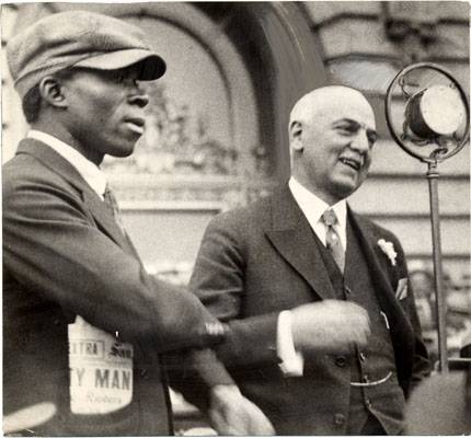 Henry Shepherd speaks for the unemployed in 1931 City Hall rally, with Mayor Rossi at his side.