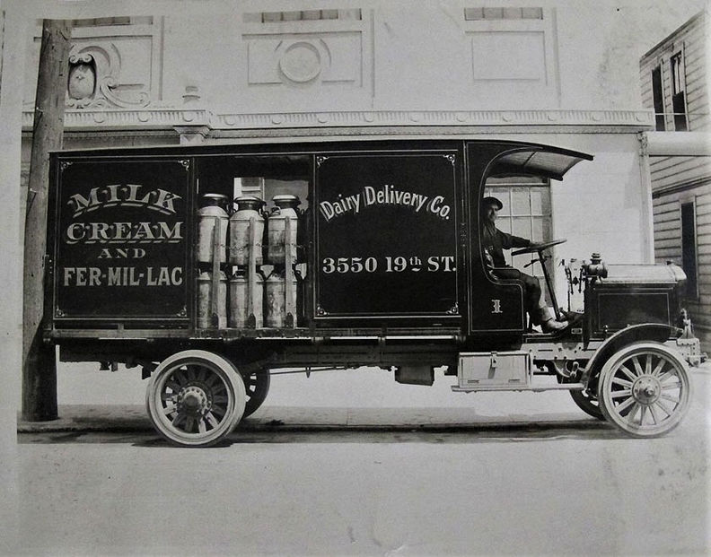 Picture of the Dairy Delivery Company, sometime after 1906. The Mission District address, 3550 19th is clearly visible on the truck.