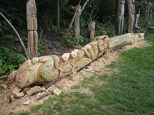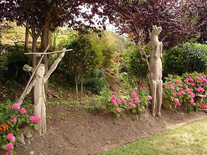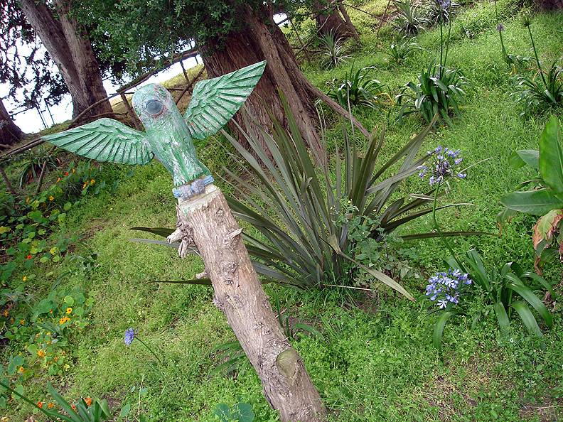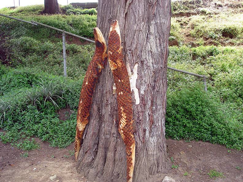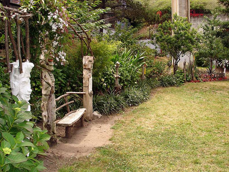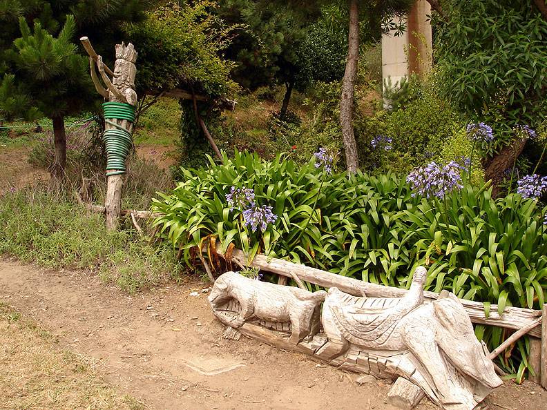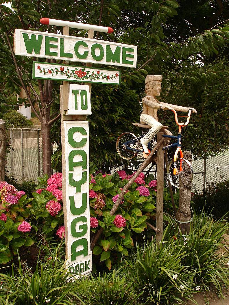 When Demetrios Braceros was assigned to change the atmosphere at Cayuga Park in 1986 by his Rec & Park Dept. employers, it had a large playing field, a playground, and a network of pathways surrounding the main field. Braceros began his work, transforming a barren landscape into a lushly ornamented park with walking trails and themed gardens that he filled with hundreds of carved figures, totem poles, and statues. Braceros found most of the wood he carved into the sculptures onsite. He also planted herbs and flowers to accompany his sculptures, creating a neighborhood oasis. His totem poles depict celebrities like ballplayer Barry Bonds and local journalist Herb Caen, as well as other musicians and athletes. He also crafted the "Garden of Eden" pathway--complete with Biblical carvings such as Moses and the burning bush, and Adam and Eve at the base of an apple tree into which was carved a big wooden snake. Braceros made carvings that pay tribute to the park's Native American namesake, and many signs which spread the message of peace, joy, and love.