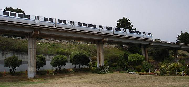Cayuga Park with pedestrian overpass and BART elevated tracks, and sculptures by park gardener Demetrios Braceros.